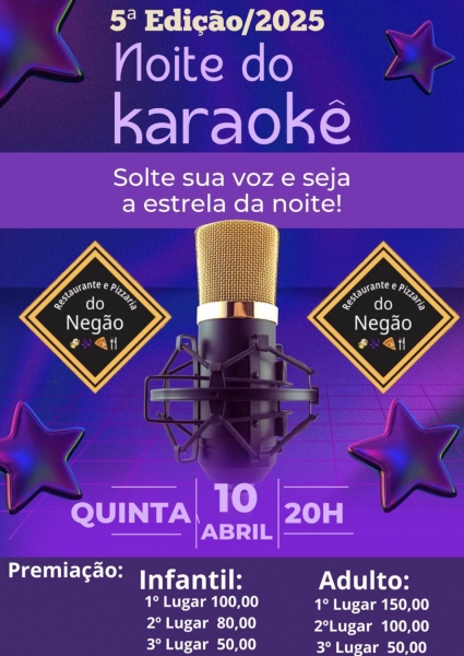 O Restaurante e Pizzaria do Negão promete agitar a semana com duas atrações especiais para o público. Nesta quinta-feira (10), a partir das 20h, acontece a 5ª edição da Noite do Karaokê, um evento já tradicional que incentiva talentos locais a soltarem a voz e brilharem no palco.