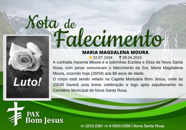 A cunhada Iracema Moura e a sobrinhas Eucléia e Elisa de Nova Santa Rosa, com pesar comunicam o falecimento da Sra. Maria Magdalena Moura, ocorrido hoje (28/04) aos 89 anos de idade.