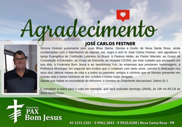 Simone Festner juntamente com suas filhas Djeine, Denise e Evelin de Nova Santa Rosa, ainda consternadas com o falecimento do esposo, pai, sogro e avô Sr José Carlos Festner, vem agradecer à Igreja Evangélica de Confissão Luterana no Brasil, à Pastora Nádia, ao Pastor Marcelo, ao Grupo de Consolação à Enlutados, ao Grupo de Diaconia, ao Hospital CEONC por todo cuidado que prestaram em sua vida, à Funerária Bom Jesus e ao saxofonista Yuri, às empresas que prestaram homenagens, a Prefeitura Municipal, em especial aos irmãos que o cuidaram com tanto amor, carinho e dedicação nos seus dois últimos meses de vida e a todos os parentes, amigos e vizinhos que se fizeram presentes em nossas vida e nesse momento de dor, a todos o nosso muito obrigado.