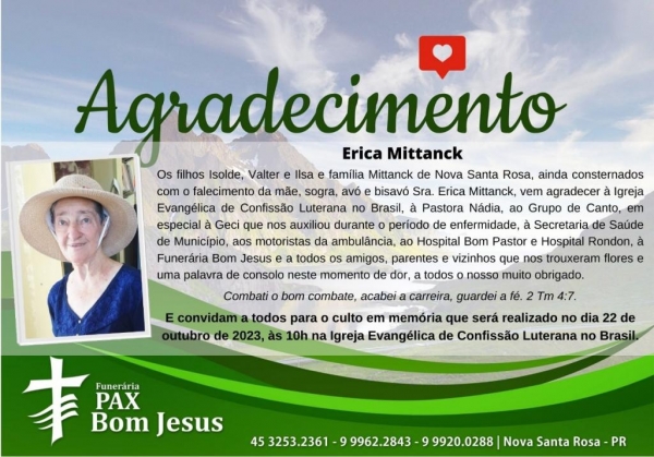 Os filhos Isolde, Valter e Ilsa e família Mittanck de Nova Santa Rosa, ainda consternados com o falecimento da mãe, sogra, avó e bisavó Sra. Erica Mittanck, vem agradecer à Igreja Evangélica de Confissão Luterana no Brasil, à Pastora Nádia, ao Grupo de Canto, em especial à Geci que nos auxiliou durante o período de enfermidade, à Secretaria de Saúde de Município, aos motoristas da ambulância, ao Hospital Bom Pastor e Hospital Rondon, à Funerária Bom Jesus e a todos os amigos, parentes e vizinhos que nos trouxeram flores e uma palavra de consolo neste momento de dor, a todos o nosso muito obrigado.