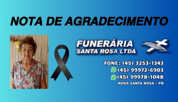 As filhas Celar e Cirlene, genros e netas de Alto Santa Fé, ainda consternados com o falecimento da mãe, sogra e avó Sra. Adelir Cristina Scheeren, vêm agradecer à todos da Secretaria Municipal de Saúde de Nova Santa Rosa, ao Hospital Bom Pastor, CEONC e respectivas equipes, aos motoristas de ambulância, à cuidadora, à Igreja Católica Santa Terezinha de Alto Santa Fé, ministros, coral e Padre Neimar Aloísio Troes, à Funerária Santa Rosa, à todos os familiares, amigos e vizinhos por toda a ajuda e apoio, aos que levaram flores e uma palavra de consolo neste momento de dor, à todos o nosso muito obrigado.