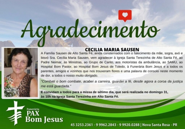 A Família Sausen de Alto Santa Fé, ainda consternados com o falecimento da mãe, sogra, avó e bisvó Sra. Cecília Maria Sausen, vem agradecer à Igreja Santa Terezinha de Alto Santa Fé, ao Padre Neimar, às Ministras, ao Grupo de Canto, aos motoristas da ambulância, ao SAMU, ao Hospital Bom Pastor, ao Hospital Bom Jesus de Toledo, à Funerária Bom Jesus e a todos os parentes, amigos e vizinhos que nos trouxeram flores e uma palavra de consolo neste momento de dor, a todos o nosso muito obrigado.