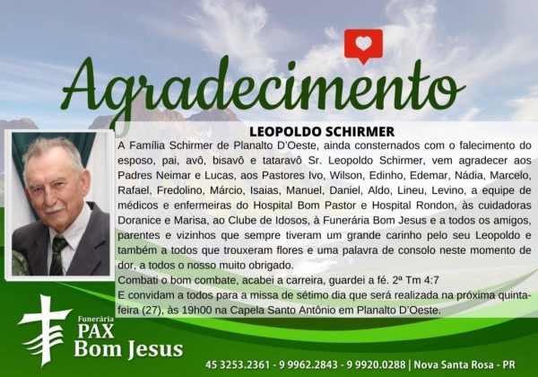 A Família Schirmer de Planalto D’Oeste, ainda consternados com o falecimento do esposo, pai, avô, bisavô e tataravô Sr. Leopoldo Schirmer, vem agradecer aos Padres Neimar e Lucas, aos Pastores Ivo, Wilson, Edinho, Edemar, Nádia, Marcelo, Rafael, Fredolino, Márcio, Isaias, Manuel, Daniel, Aldo, Lineu, Levino, a equipe de médicos e enfermeiras do Hospital Bom Pastor e Hospital Rondon, às cuidadoras Doranice e Marisa, ao Clube de Idosos, à Funerária Bom Jesus e a todos os amigos, parentes e vizinhos que sempre tiveram um grande carinho pelo seu Leopoldo e também a todos que trouxeram flores e uma palavra de consolo neste momento de dor, a todos o nosso muito obrigado.