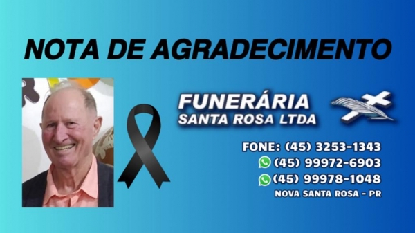 Ao Padre Neimar, ministros, Coral da Igreja Católica Santa Terezinha; ao Hospital Bom Pastor e equipe de enfermeiros; aos médicos da Unimed de Toledo; a cuidadora; a Funerária Santa Rosa; a todos que de uma forma ou de outra ajudaram a família neste período de enfermidade; aos vizinhos, parentes e amigos, bem como a todos que enviaram flores e coroas, enfim a todas as pessoas pelas palavras de apoio e conforto neste momento de dor.