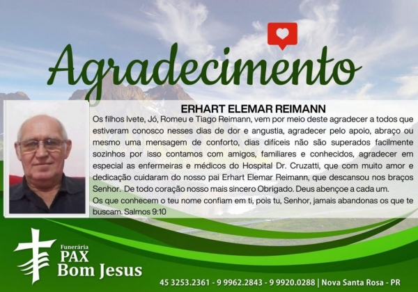 Os filhos Ivete, Jó, Romeu e Tiago Reimann, vem por meio deste agradecer a todos que estiveram conosco nesses dias de dor e angustia, agradecer pelo apoio, abraço ou mesmo uma mensagem de conforto, dias difíceis não são superados facilmente sozinhos por isso contamos com amigos, familiares e conhecidos, agradecer em especial as enfermeiras e médicos do Hospital Dr. Cruzatti, que com muito amor e dedicação cuidaram do nosso pai Erhart Elemar Reimann, que descansou nos braços Senhor.