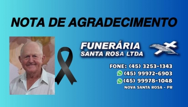 A Igreja Batista Independente Salém de Planalto do Oeste, juntamente com seu Pastor Rubino Stelter e Pastor Valdi Friske, o Grupo de Canto, ao Hospital Rondon e toda a sua equipe, a Secretaria de Saúde de Nova Santa Rosa, ao Laudemir (Abacaxi), aos vizinhos, parentes e amigos, a todos que enviaram flores e que deixaram uma palavra de consolo neste momento de dor. A todos o nosso muito obrigado.