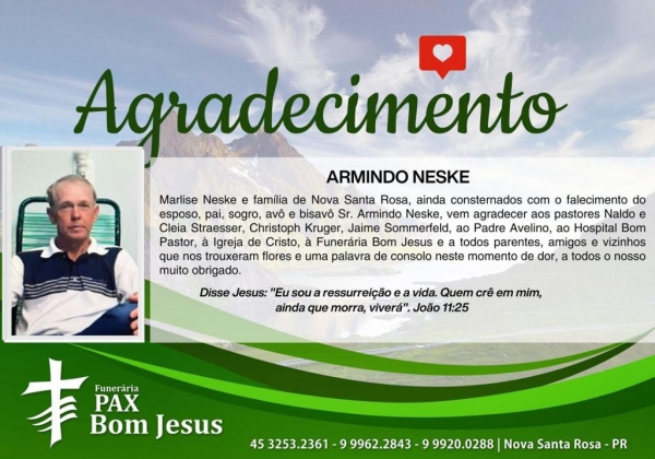 Marlise Neske e família de Nova Santa Rosa, ainda consternados com o falecimento do esposo, pai, sogro, avô e bisavô Sr. Armindo Neske, vem agradecer aos pastores Naldo e Cleia Straesser, Christoph Kruger, Jaime Sommerfeld, ao Padre Avelino, ao Hospital Bom Pastor, à Igreja de Cristo, à Funerária Bom Jesus e a todos parentes, amigos e vizinhos que nos trouxeram flores e uma palavra de consolo neste momento de dor, a todos o nosso muito obrigado.