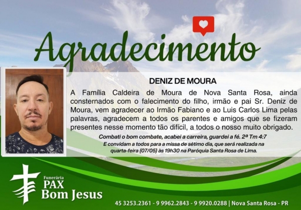 A Família Caldeira de Moura de Nova Santa Rosa, ainda consternados com o falecimento do filho, irmão e pai Sr. Deniz de Moura, vem agradecer ao Irmão Fabiano e ao Luis Carlos Lima pelas palavras, agradecem a todos os parentes e amigos que se fizeram presentes nesse momento tão difícil, a todos o nosso muito obrigado.