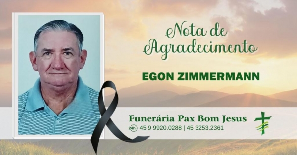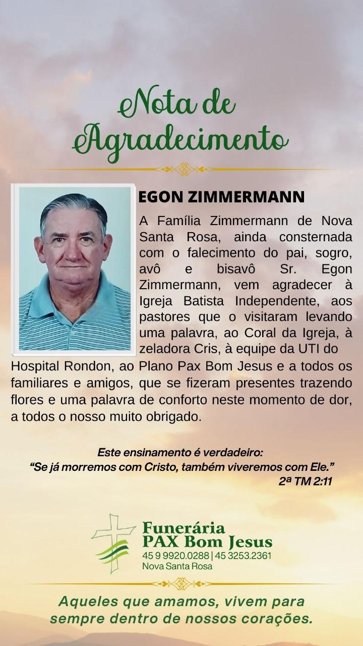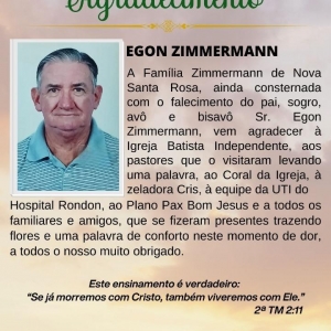 A Família Zimmermann de Nova Santa Rosa, ainda consternada com o falecimento do pai, sogro, avô e bisavô Sr. Egon Zimmermann, vem agradecer à Igreja Batista Independente, aos pastores que o visitaram levando uma palavra, ao Coral da Igreja, à zeladora Cris, à equipe da UTI do