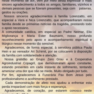 Agradecemos, de forma especial, à servidora pública Paula Hein e ao vereador Ari Schimit, por se colocarem à disposição da família com solidariedade e atenção.