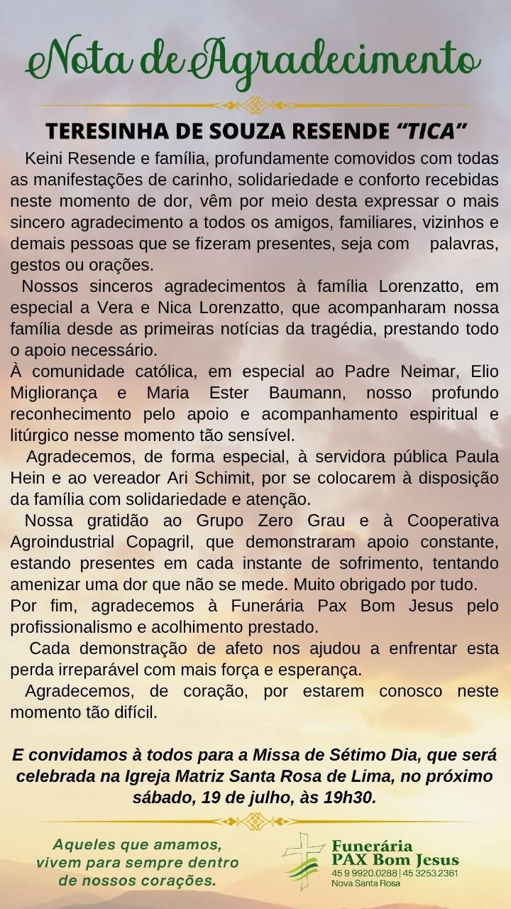 Keini Resende e família, profundamente comovidos com todas as manifestações de carinho, solidariedade e conforto recebidas neste momento de dor, vêm por meio desta expressar o mais sincero agradecimento a todos os amigos, familiares, vizinhos e demais pessoas que se fizeram presentes, seja com palavras, gestos ou orações.