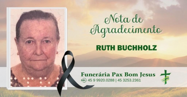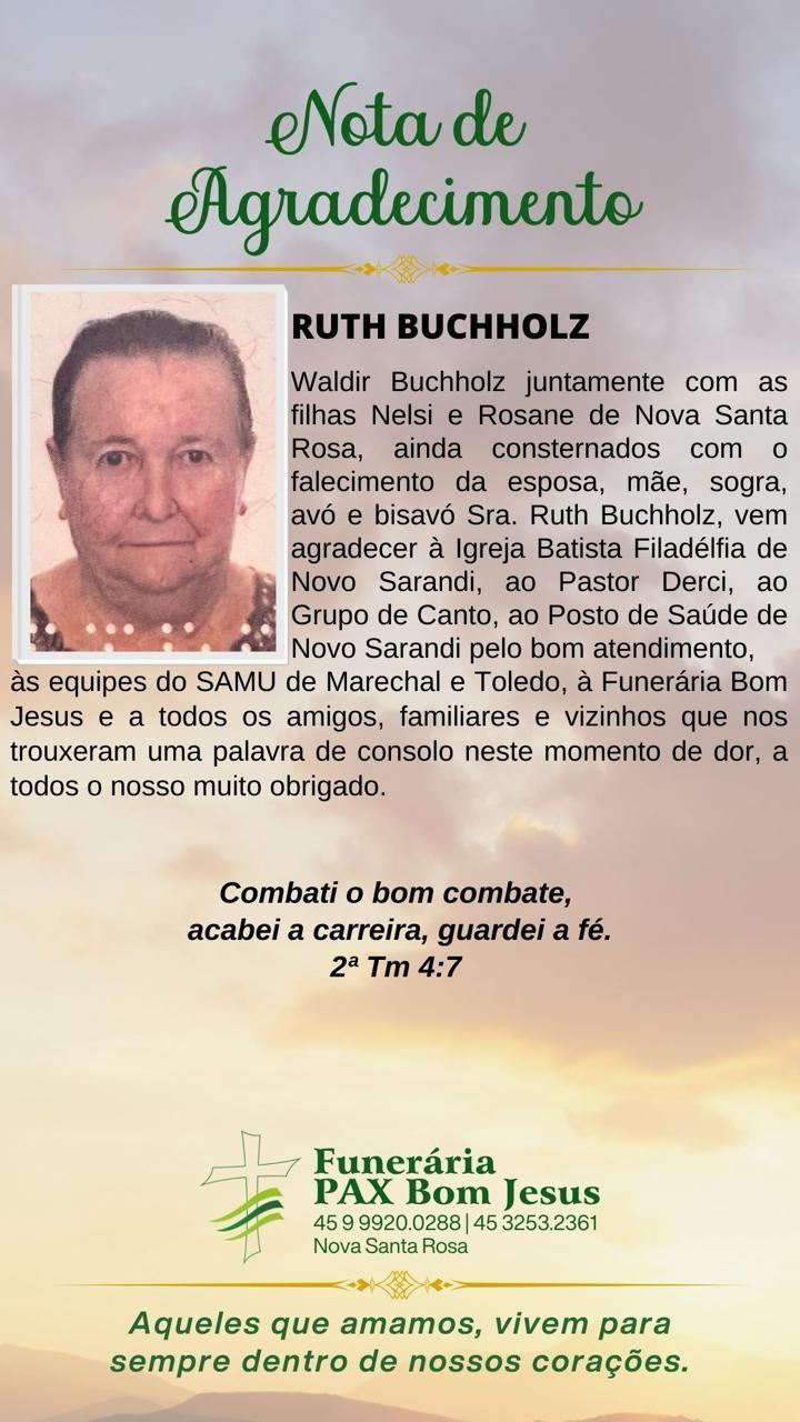 Waldir Buchholz juntamente com as filhas Nelsi e Rosane de Nova Santa Rosa, ainda consternados com o falecimento da esposa, mãe, sogra, avó e bisavó Sra. Ruth Buchholz, vem agradecer à Igreja Batista Filadélfia de Novo Sarandi, ao Pastor Derci, ao Grupo de Canto, ao Posto de Saúde de Novo Sarandi pelo bom atendimento, às equipes do SAMU de Marechal e Toledo, à Funerária Bom Jesus e a todos os amigos, familiares e vizinhos que nos trouxeram uma palavra de consolo neste momento de dor, a todos o nosso muito obrigado.