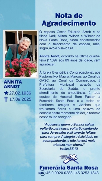O esposo Oscar Eduardo Arndt e os filhos Darli, Milton, Wilson e Wilmar de Nova Santa Rosa, ainda consternados com o falecimento da esposa, mãe, sogra, avó e bisavó Sra. Annita Arndt, ocorrido na última quarta-feira (17), aos 89 anos de idade, vem agradecer: