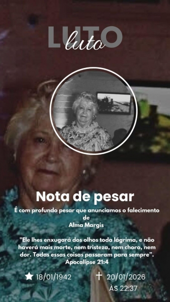 Helga Margis kelm e família de Nova Santa Rosa comunica, com pesar, o falecimento da mãe Alma Margis, ocorrido nesta terça-feira (20), no hospital Santa Maria em Brasília.