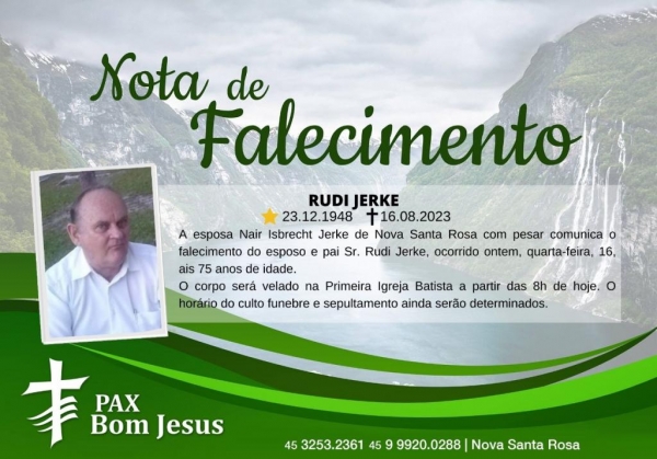 A esposa Nair Isbrecht Jerke de Nova Santa Rosa com pesar comunica o falecimento do esposo e pai Sr. Rudi Jerke, ocorrido ontem, quarta-feira, 16, ais 75 anos de idade.