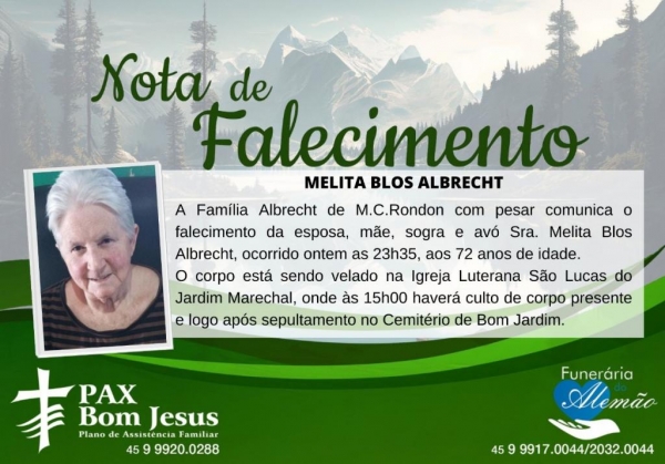 A Família Albrecht, de Marechal Cândido Rondon, com pesar comunica o falecimento da esposa, mãe, sogra e avó, Sra. Melita Blos Albrecht, ocorrido ontem às 23h35, aos 72 anos de idade.