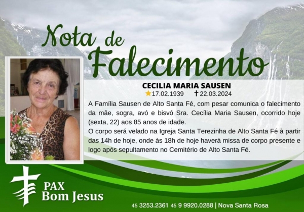 A Família Sausen de Alto Santa Fé, com pesar comunica o falecimento da mãe, sogra, avó e bisavó Sra. Cecília Maria Sausen, ocorrido hoje (sexta, 22) aos 85 anos de idade.