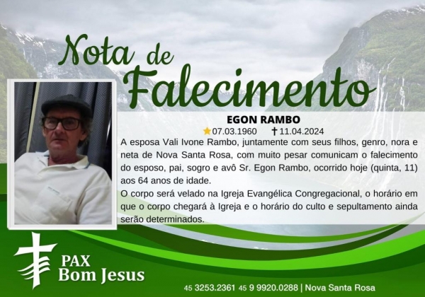 A esposa Vali Ivone Rambo, juntamente com seus filhos, genro, nora e neta de Nova Santa Rosa, com muito pesar comunicam o falecimento do esposo, pai, sogro e avô Sr. Egon Rambo, ocorrido hoje (quinta, 11) aos 64 anos de idade.