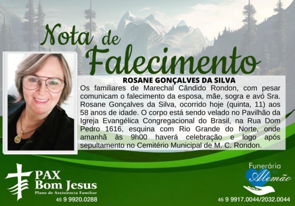 Os familiares de Marechal Cândido Rondon, com pesar comunicam o falecimento da esposa, mãe, sogra e avó Sra. Rosane Gonçalves da Silva, ocorrido ontem (11) aos 58 anos de idade.