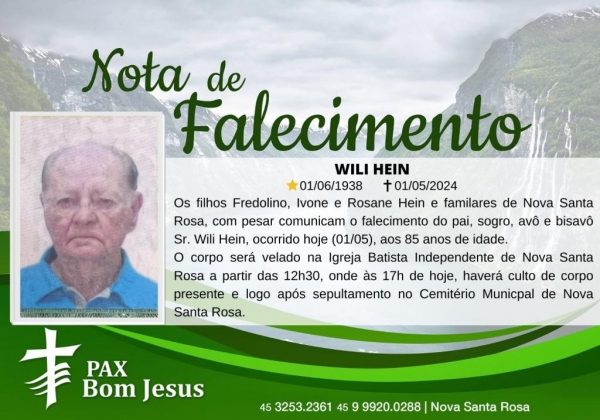 Os filhos Fredolino, Ivone e Rosane Hein e familares de Nova Santa Rosa, com pesar comunicam o falecimento do pai, sogro, avô e bisavô Sr. Wili Hein, ocorrido hoje (01/05), aos 85 anos de idade.