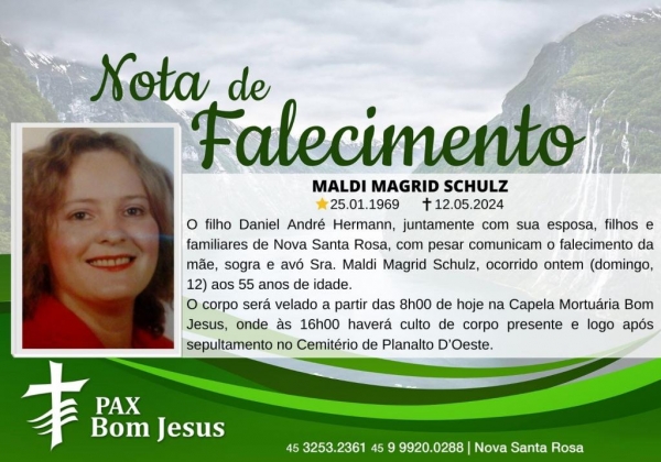 O filho Daniel André Hermann, juntamente com sua esposa, filhos e familiares de Nova Santa Rosa, com pesar comunicam o falecimento da mãe, sogra e avó Sra. Maldi Magrid Schulz, ocorrido ontem (domingo, 12) aos 55 anos de idade.