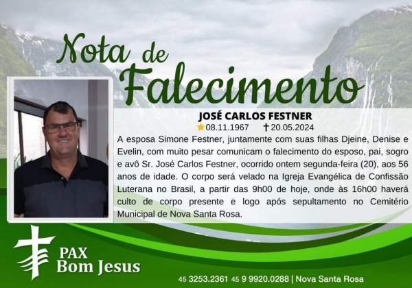A esposa Simone Festner, juntamente com suas filhas Djeine, Denise e Evelin, com muito pesar comunicam o falecimento do esposo, pai, sogro e avô Sr. José Carlos Festner, ocorrido ontem segunda-feira (20), aos 56 anos de idade.