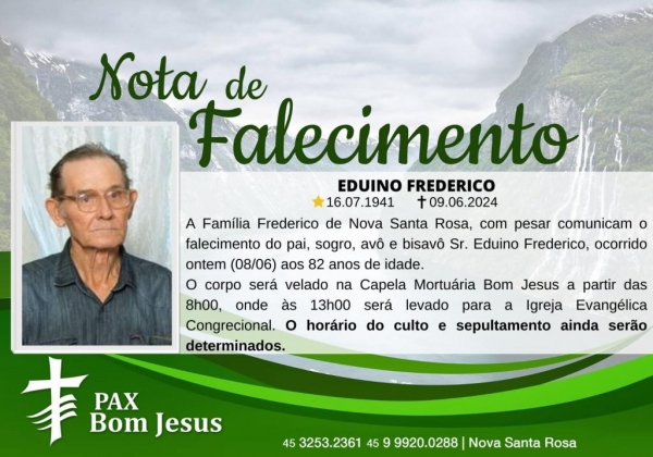 A Família Frederico de Nova Santa Rosa, com pesar comunicam o falecimento do pai, sogro, avô e bisavô Sr. Eduino Frederico, ocorrido ontem (08/06) aos 82 anos de idade.