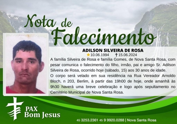 A família Silveira de Rosa e família Gomes, de Nova Santa Rosa, com pesar comunica o falecimento do filho, irmão, pai e amigo Sr. Adilson Silveira de Rosa, ocorrido hoje (sábado, 15) aos 30 anos de idade.