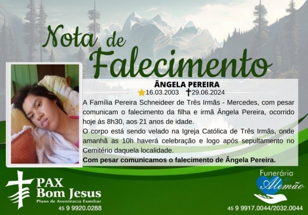 A Família Pereira Schneideer de Três Irmãs - Mercedes, com pesar comunicam o falecimento da filha e irmã Ângela Pereira, ocorrido hoje às 8h30, aos 21 anos de idade.