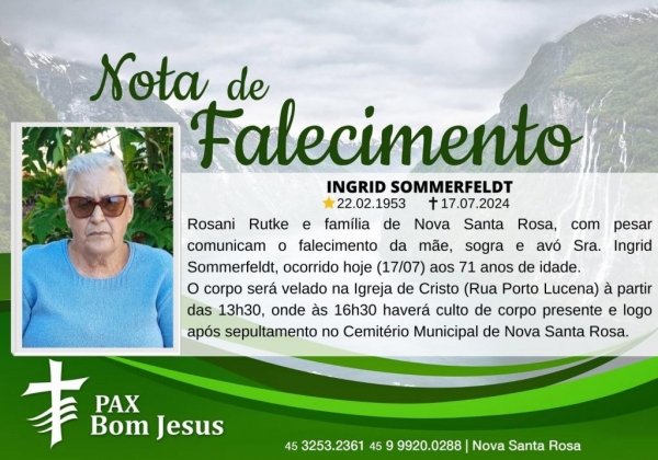 Rosani Rutke e família de Nova Santa Rosa, com pesar comunicam o falecimento da mãe, sogra e avó Sra. Ingrid Sommerfeldt, ocorrido hoje (17/07) aos 71 anos de idade.