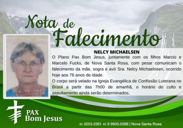 O Plano Pax Bom Jesus, juntamente com os filhos Marcio e Marcelo Fucks, de Nova Santa Rosa, com pesar comunicam o falecimento da mãe, sogra e avó Sra. Nelcy Michaelnsen, ocorrido hoje aos 76 anos de idade.