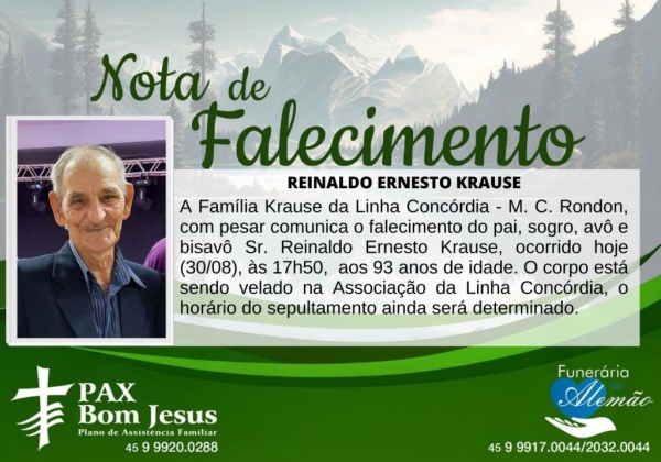 A Família Krause da Linha Concórdia - M. C. Rondon, com pesar comunica o falecimento do pai, sogro, avô e bisavô Sr. Reinaldo Ernesto Krause, ocorrido hoje (30/08), às 17h50, aos 93 anos de idade.