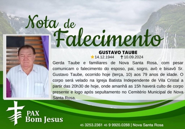 Gerda Taube e familiares de Nova Santa Rosa, com pesar comunicam o falecimento do esposo, pai, sogro, avô e bisavô Sr. Gustavo Taube, ocorrido hoje (10) aos 79 anos de idade.