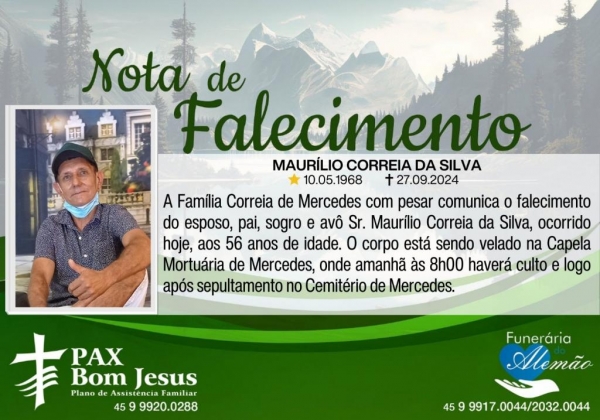 A Família Correia, de Mercedes, com pesar comunica o falecimento do esposo, pai, sogro e avô Sr. Maurílio Correia da Silva, ocorrido hoje (27), aos 56 anos de idade.