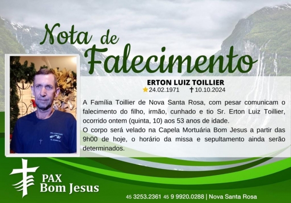 A Família Toillier de Nova Santa Rosa, com pesar comunica o falecimento do filho, irmão, cunhado e tio Sr. Erton Luiz Toillier, ocorrido ontem (10), aos 53 anos de idade.
