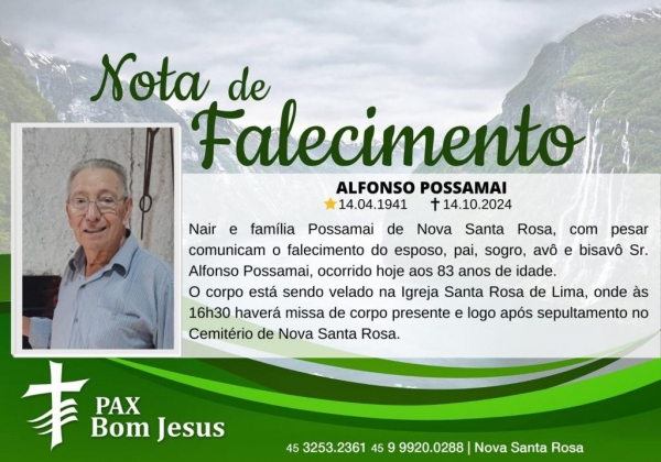 Nair e família Possamai de Nova Santa Rosa, com pesar comunicam o falecimento do esposo, pai, sogro, avô e bisavô Sr. Alfonso Possamai, ocorrido hoje (14) aos 83 anos de idade.