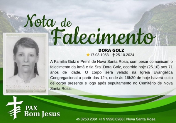 A Família Golz e Prehll de Nova Santa Rosa, com pesar comunicam o falecimento da irmã e tia Sra. Dora Golz, ocorrido hoje (25.10) aos 71 anos de idade.