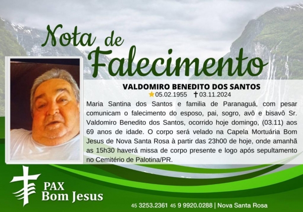 Maria Santina dos Santos e familia de Paranaguá, com pesar comunicam o falecimento do esposo, pai, sogro, avô e bisavô Sr. Valdomiro Benedito dos Santos, ocorrido hoje domingo (03) aos 69 anos de idade.