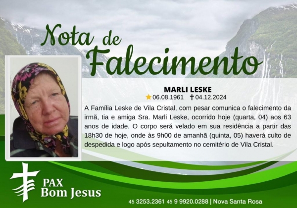 A Família Leske de Vila Cristal, com pesar comunica o falecimento da irmã, tia e amiga Sra. Marli Leske, ocorrido hoje (quarta, 04) aos 63 anos de idade.