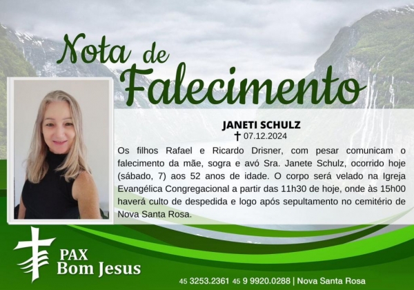 Os filhos Rafael e Ricardo Drisner, com pesar comunicam o falecimento da mãe, sogra e avó Sra. Janete Schulz, ocorrido hoje (07) aos 52 anos de idade.