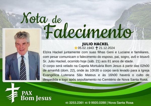 Elzira Hackel juntamente com suas filhas Geni e Luciane e familiares, com pesar comunicam o falecimento do esposo, pai, sogro, avô e bisavô Sr. Julio Hackel, ocorrido ontem (21) aos 81 anos de idade.