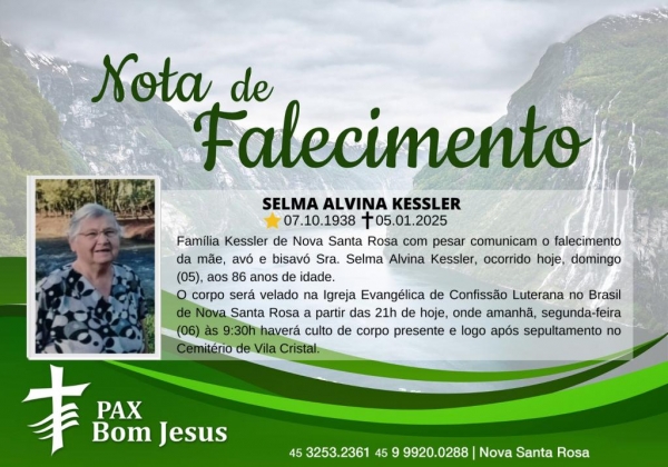 Família Kessler de Nova Santa Rosa com pesar comunicam o falecimento da mãe, avó e bisavó Sra. Selma Alvina Kessler, ocorrido hoje, domingo (05), aos 86 anos de idade.