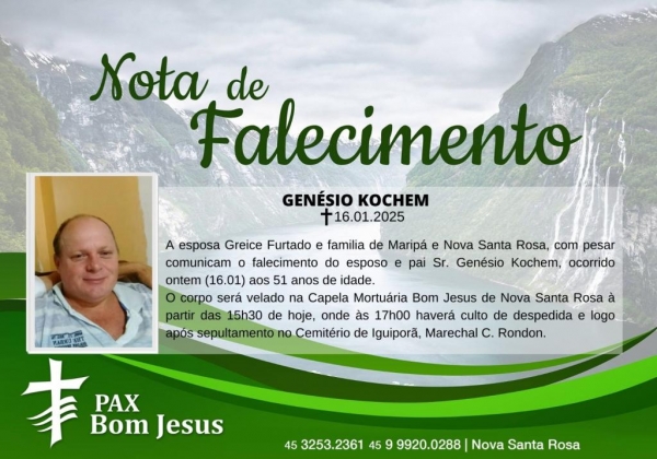 A esposa Greice Furtado e familia de Maripá e Nova Santa Rosa, com pesar comunicam o falecimento do esposo e pai Sr. Genésio Kochem, ocorrido ontem (16.01) aos 51 anos de idade.