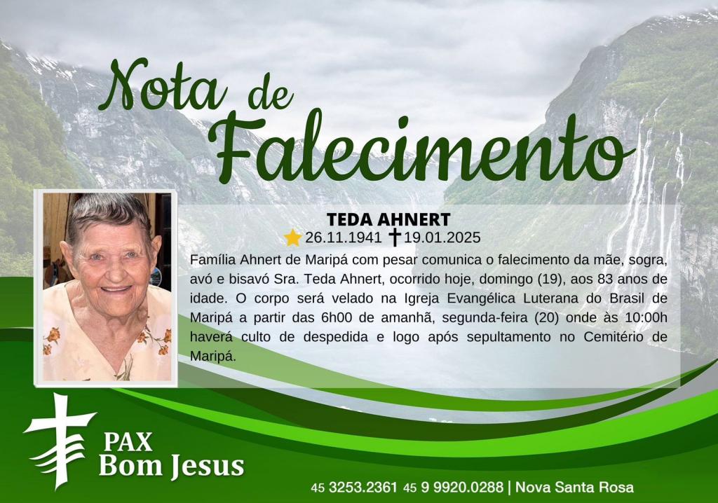 Família Ahnert de Maripá com pesar comunica o falecimento da mãe, sogra, avó e bisavó Sra. Teda Ahnert, ocorrido hoje, domingo (19), aos 83 anos de idade.
