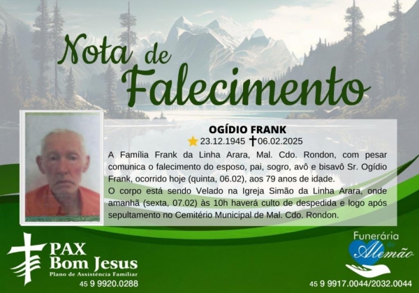 A Família Frank da Linha Arara, Mal. Cdo. Rondon, com pesar comunica o falecimento do esposo, pai, sogro, avô e bisavô Sr. Ogídio Frank, ocorrido hoje (quinta, 06.02), aos 79 anos de idade.