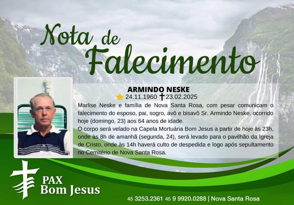 Marlise Neske e família de Nova Santa Rosa, com pesar comunicam o falecimento do esposo, pai, sogro, avô e bisavô Sr. Armindo Neske, ocorrido hoje (domingo, 23) aos 64 anos de idade.