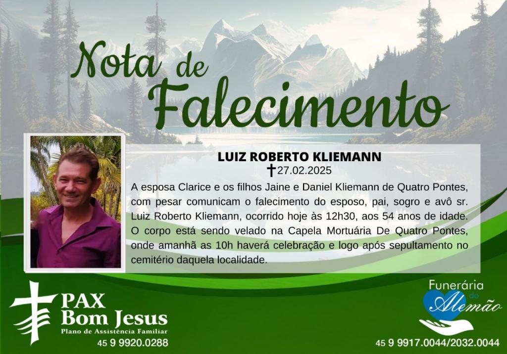 A esposa Clarice e os filhos Jaine e Daniel Kliemann de Quatro Pontes, com pesar comunicam o falecimento do esposo, pai, sogro e avô sr. Luiz Roberto Kliemann, ocorrido ontem (27) às 12h30, aos 54 anos de idade.