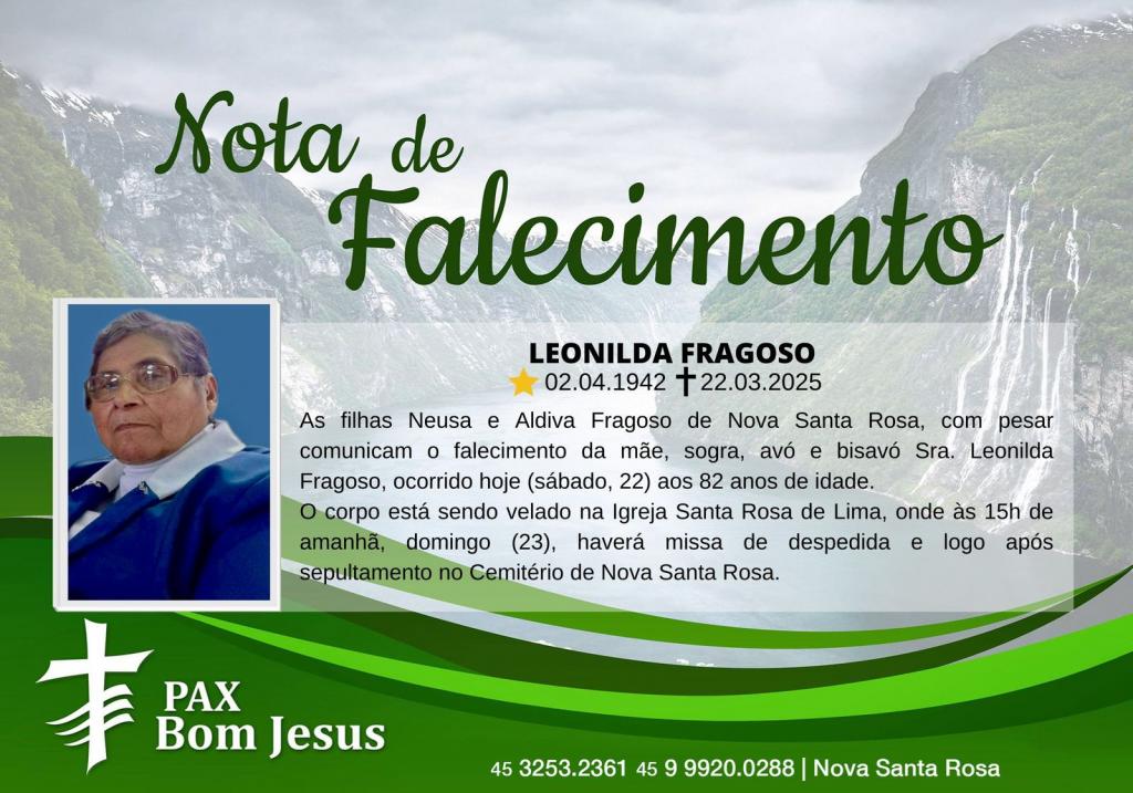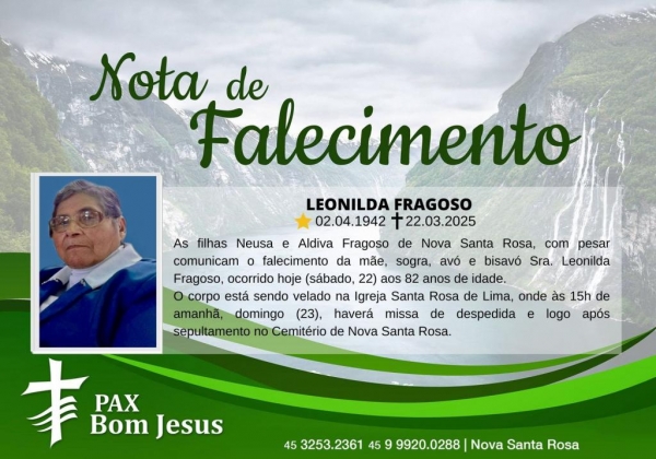 As filhas Neusa e Aldiva Fragoso de Nova Santa Rosa, com pesar comunicam o falecimento da mãe, sogra, avó e bisavó Sra. Leonilda Fragoso, ocorrido hoje (22) aos 82 anos de idade.