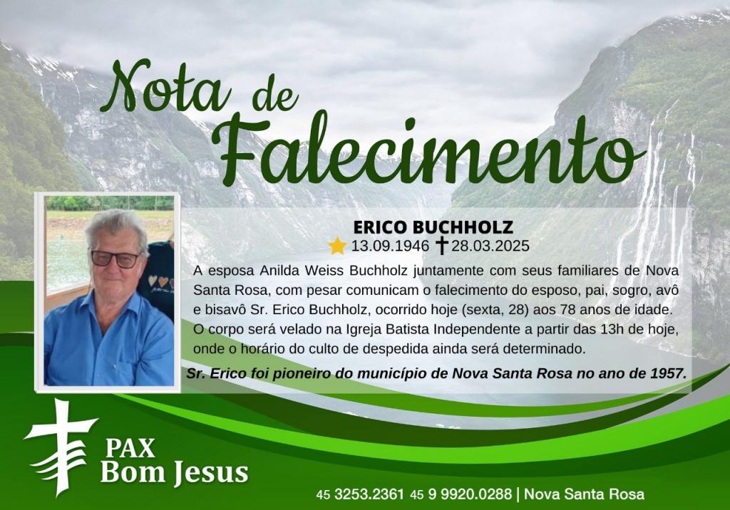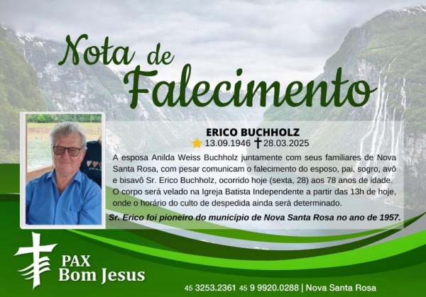 A esposa Anilda Weiss Buchholz juntamente com seus familiares de Nova Santa Rosa, com pesar comunicam o falecimento do esposo, pai, sogro, avô e bisavô Sr. Erico Buchholz, ocorrido hoje (sexta, 28) aos 78 anos de idade.
