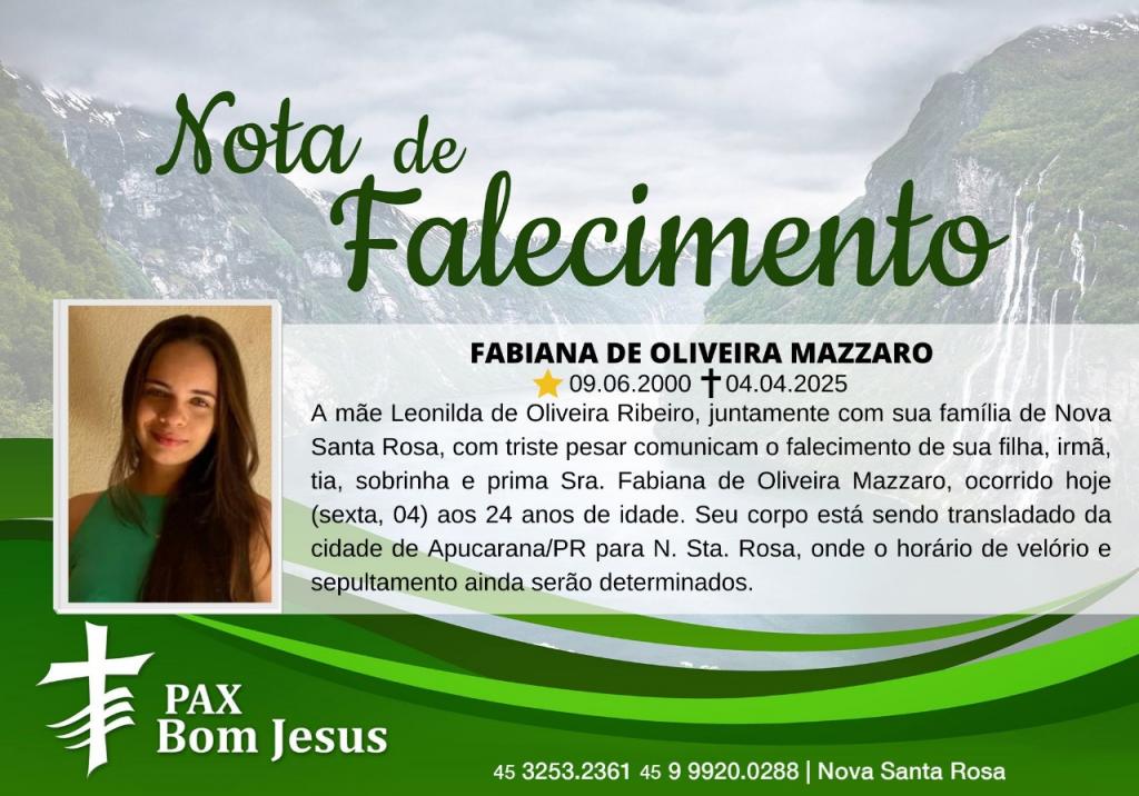 A mãe Leonilda de Oliveira Ribeiro, juntamente com sua família de Nova Santa Rosa, com triste pesar comunicam o falecimento de sua filha, irmã, tia, sobrinha e prima Sra. Fabiana de Oliveira Mazzaro, ocorrido hoje (sexta, 04) aos 24 anos de idade.